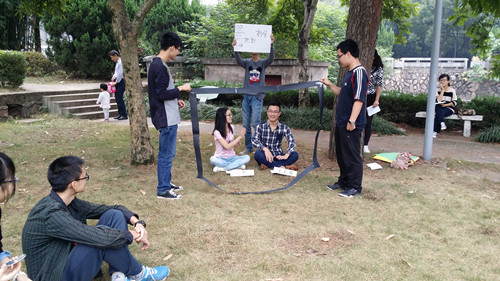 “今天是10月18日星期六,农历九月廿五,欢迎收看今天的新闻联播。”科教131班的团日活动以“大话美丽师大”情景剧幽默开场,不仅用夸张的表演指出了同学们在日常生活中的陋习,还简单介绍了我院定期组织小红帽将自行车摆放整齐,清扫牛皮癣等活动。使支部成员对“美丽师大”建设有了更加充分的理解。