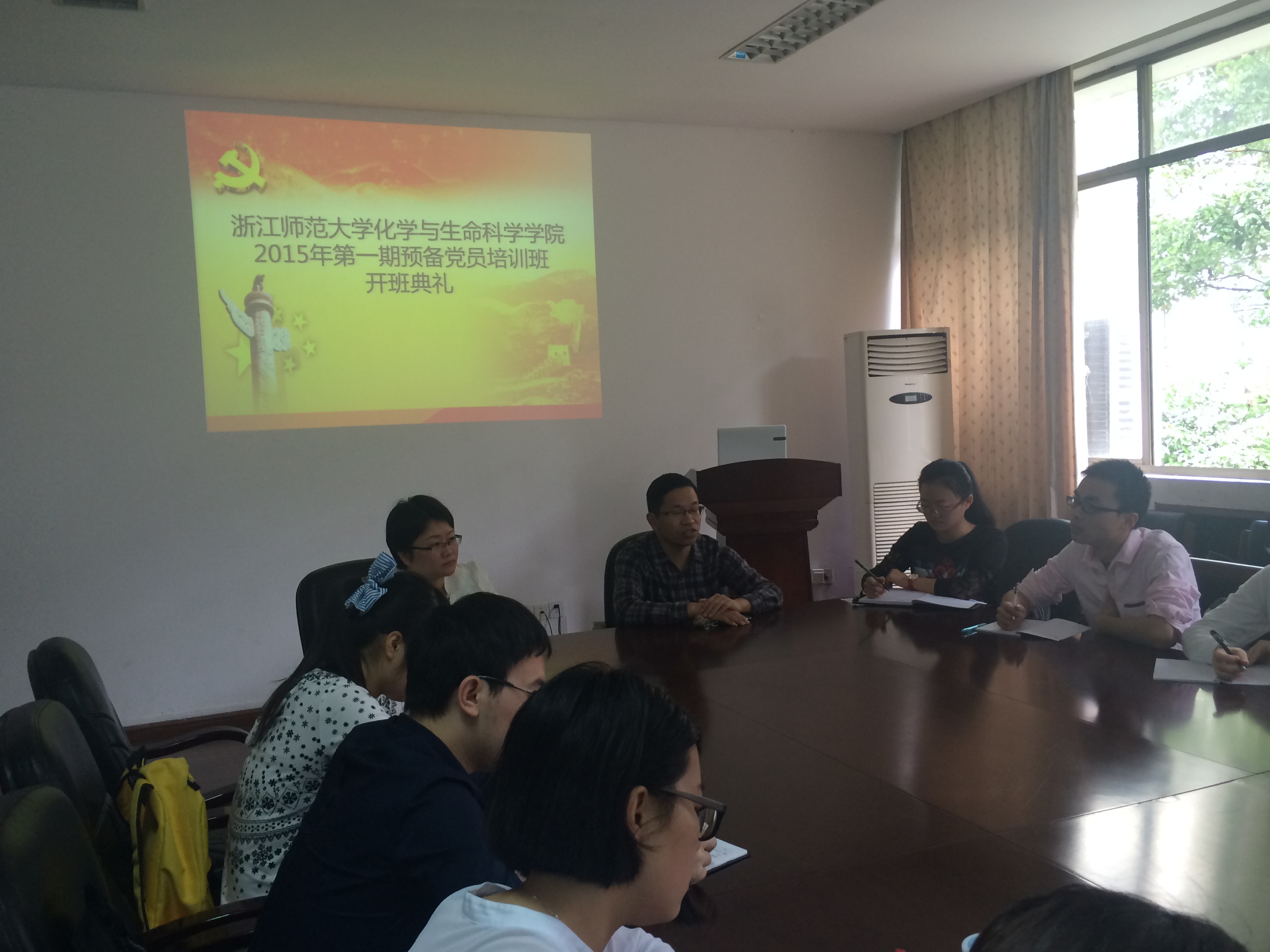 5月9日上午8点整,浙江师范大学化学与生命科学学院2015年第一期预备党员培训班开班典礼于7幢会议室顺利召开。开班典礼由预备党员周安琪主持,出席典礼的嘉宾有生化学院党委书记徐建鹏、党委副书记马莉老师。