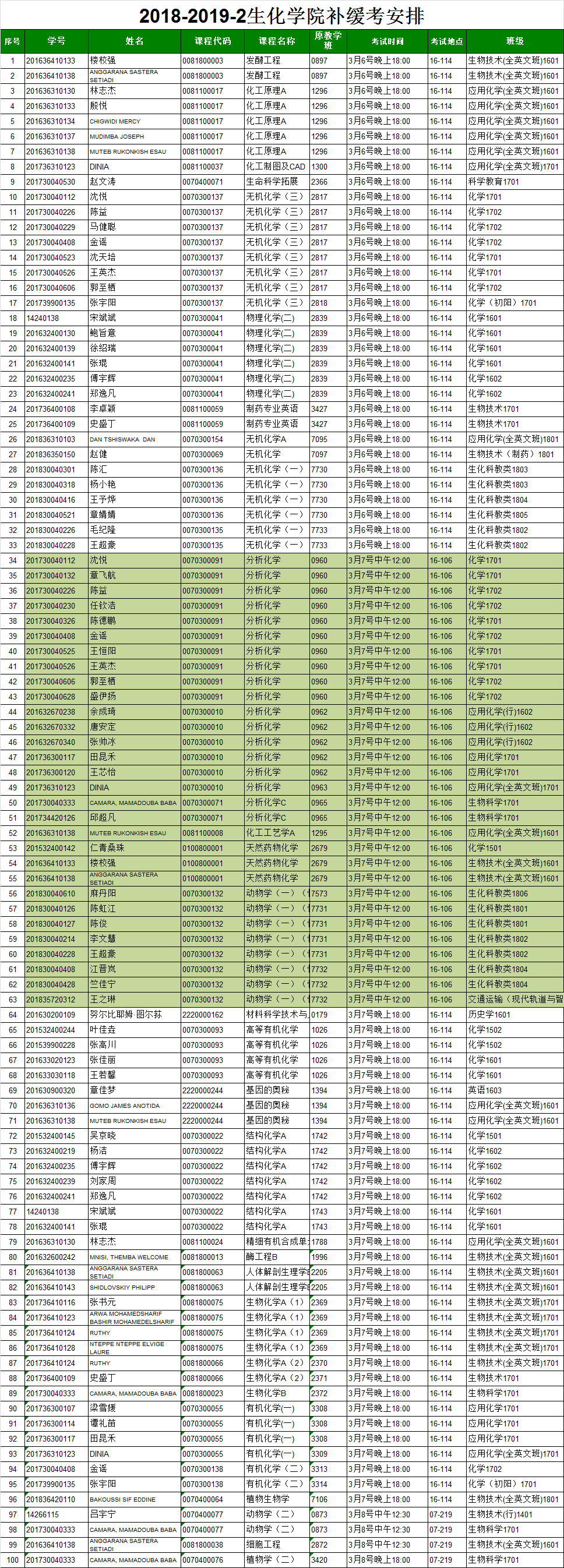 关于2018-2019学年第2学期的补缓考安排现予公布,详情请见附件。如有遗漏请及时联系生化学院教务办82282325,谢谢!