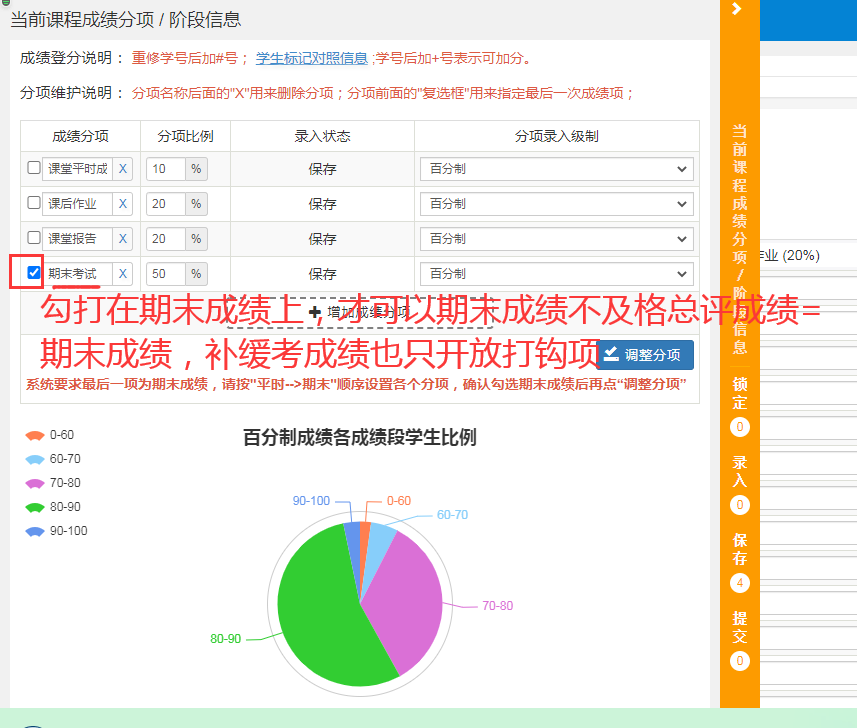 请在设置分项的时候务必在期末成绩前的小方框内打钩,如果打钩错误,将会影响补缓考成绩录入。学校文件规定,平时成绩不低于50%,期末成绩不高于50%,期末成绩不及格系统总评成绩为卷面不及格成绩。