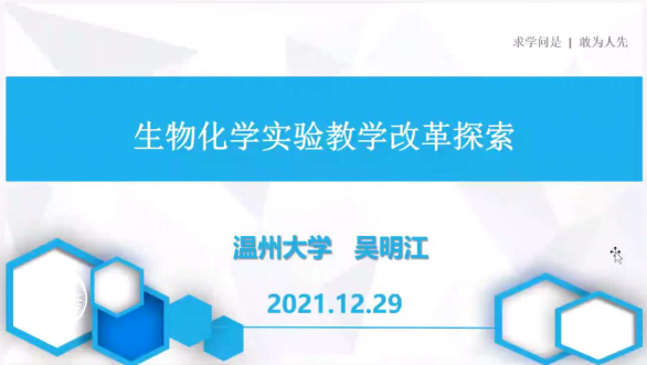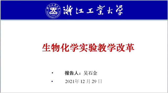 孙梅好副院长致欢迎辞,他介绍了学院教学现状、改革创新举措和取得的成果。浙江工业大学生物工程学院吴石金副院长以“浙工大生物化学实验课程教学改革的现状与思考”、温州大学生命与环境科学学院吴明江教授以“温大生物化学实验课程改革与探索”、孙梅好以“生物化学实验课程思政元素挖掘及思政育人-以‘凯氏定氮法测定蛋白质含量’为例”为题分别介绍了各高校在《生物化学实验》教学改革中取得的成绩。