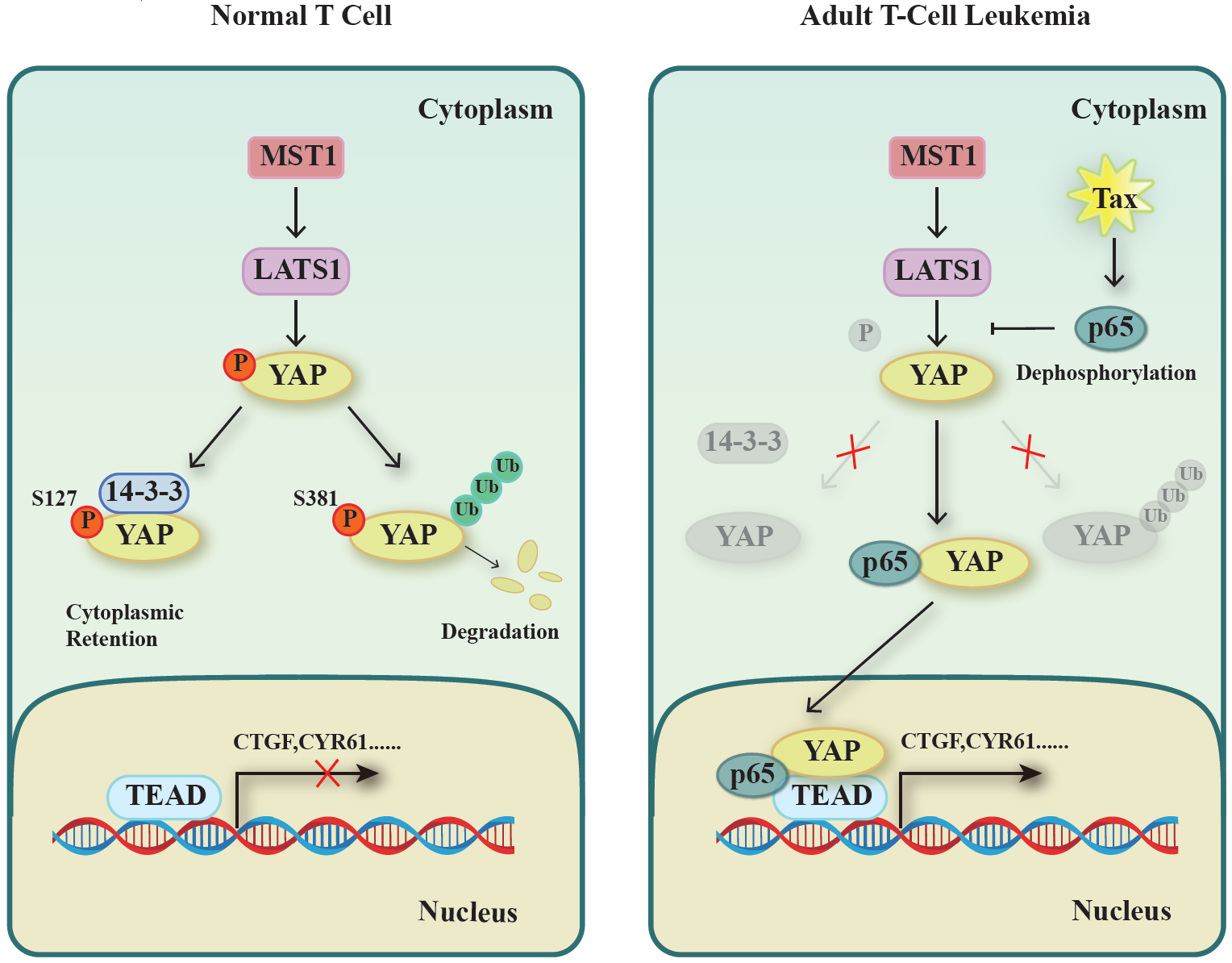 该研究首次发现NF-kB/p65诱导的YAP激活对于维持ATL白血病细胞的恶性增殖至关重要。而且研究首次揭示了两条重要信号通路NF-kBHippo之间的相互调控机制。研究成果为揭示HTLV-1病毒诱导成人T细胞白血病的发生提供了新的机制,对进一步探索成人T细胞白血病治疗手段具有重要的意义。