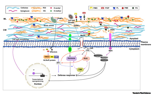 作为植物细胞的最外层结构,细胞壁不仅参与植物生长发育,形态建成,也是病原菌入侵植物的第一道防御体系。在病原菌入侵宿主细胞的过程中细胞壁结构完整性受到破坏,而植物在感知细胞壁损伤后,通常会激发一系列的防御反应,包括植物细胞壁组分和结构的重塑。随着近年来对植物细胞壁模型和果胶的重新审视,果胶被认为维持细胞壁机械性能和细胞壁完整性的重要组成成分,在病原菌感知和防御反应的激活方面起着至关重要的作用。该论文总结了近年来有关果胶调控植物免疫的最新研究进展,构建了果胶调节植物免疫的调控网络图。并进一步以番茄果实为模型,阐释了果实软化过程细胞壁代谢特点以及细胞壁完整性如何影响和调控果实抗病性。论文提出了独到的见解与未来重要的研究方向,为植物响应病原菌胁迫的研究领域提供了新的视角。