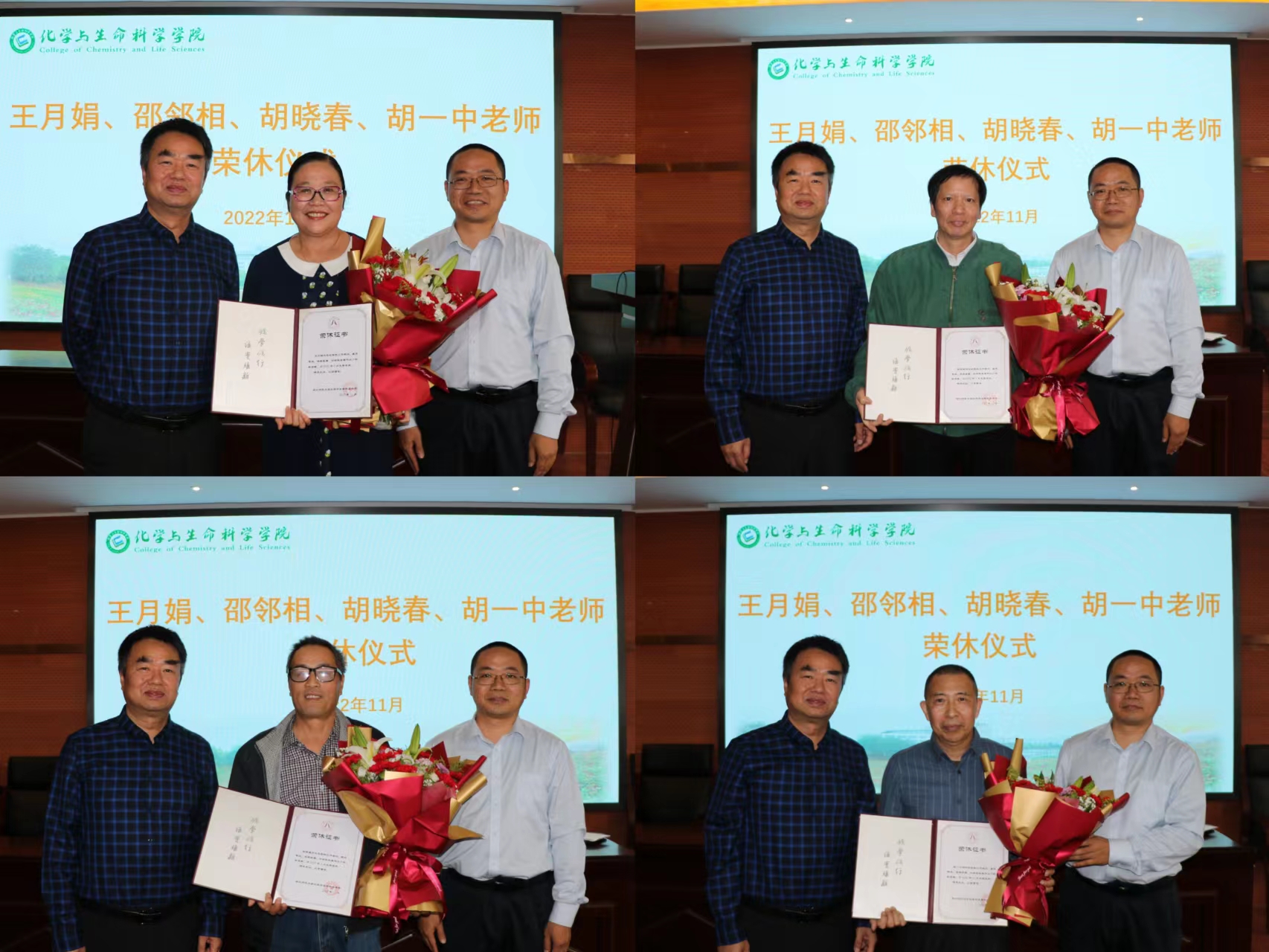 11月9日下午,学院在7幢301报告厅为王月娟、邵邻相、胡晓春、胡一中四位老师举行了简短而庄严的荣休仪式。