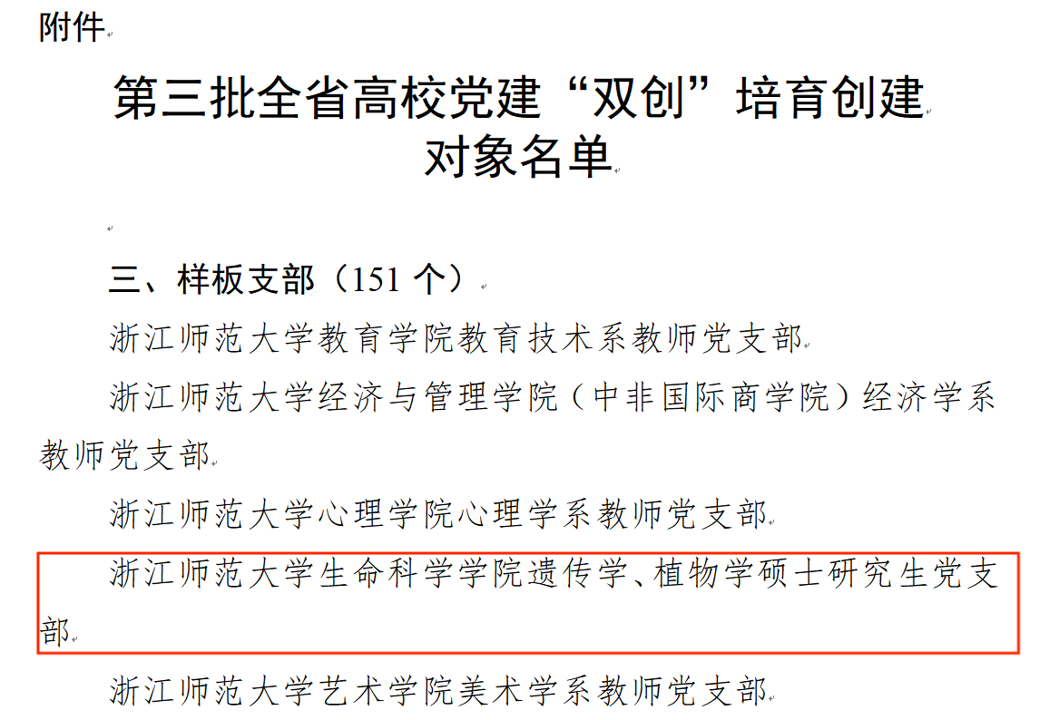近日,中共浙江省委教育工作委员会办公室公布了第三批全省高校党建“双创”培育创建对象名单,浙江太阳成集团tyc122cc入口遗传学、植物学硕士研究生党支部立项第三批全省高校样板支部培育创建对象。