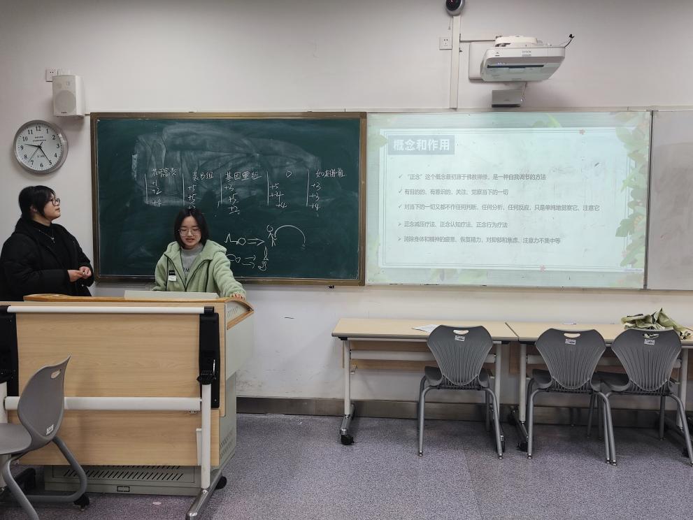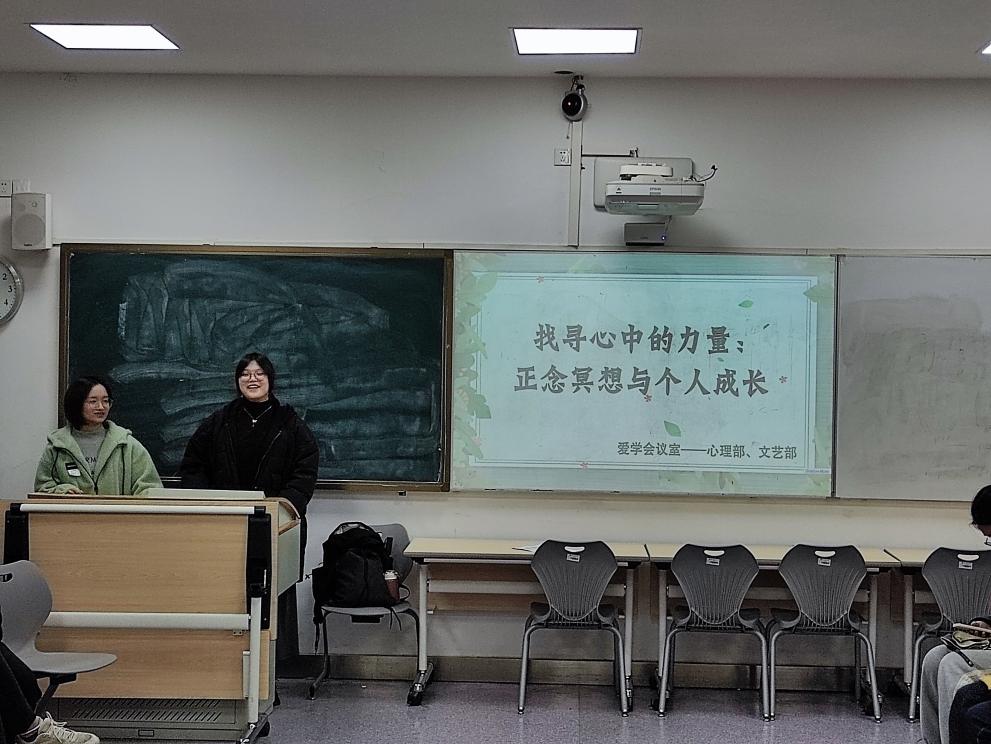 12月16日晚,浙江太阳成集团tyc122cc入口团委学生会文艺部、心理部联合举办“找寻心中的力量:正念冥想与个人成长”主题爱学会议室活动。文艺部副部徐沁和心理部副部曹瀚丹主持本次活动。