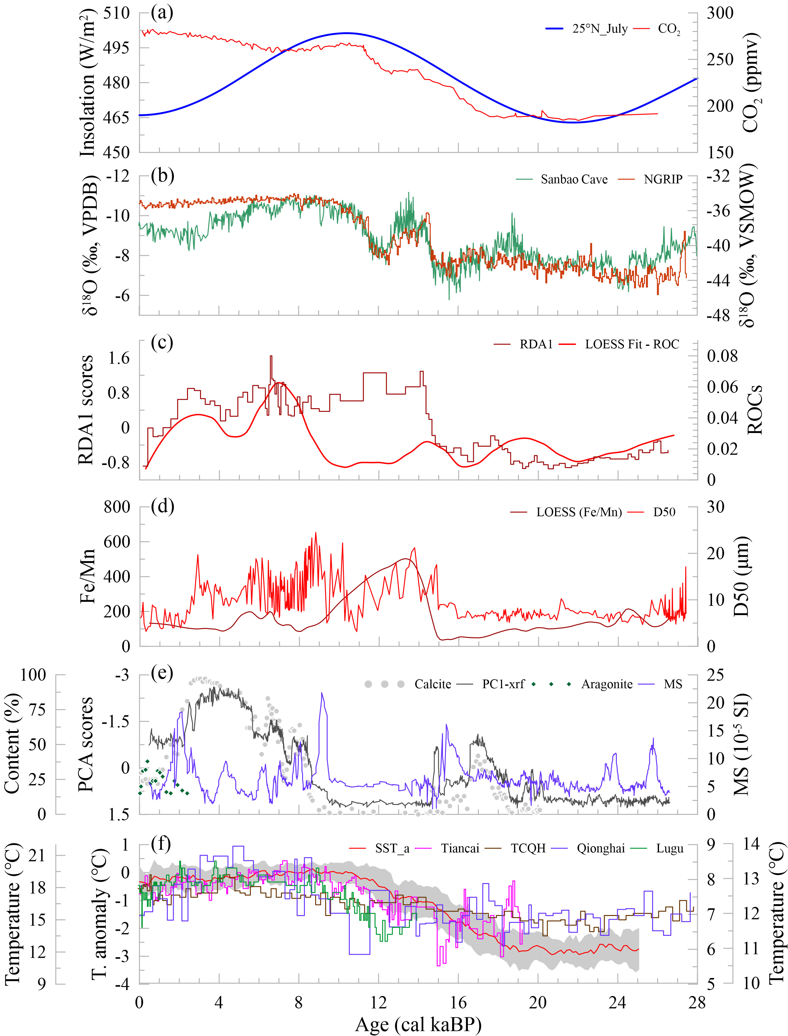 现代植被是在长期气候变化和人类活动干扰叠加影响下形成的,全新世人类活动逐渐增强,其对自然植被的干扰和改造也逐渐加深。第一项研究工作以浙江杭州湾地区26个孢粉记录为基础,分析了新石器时代早期水稻种植文化的发展动态及其对植被组成的影响。第二项研究则以云南异龙湖的沉积物孢粉为依据,揭示了滇中地区末次盛冰期以来长期气候变化和植被变化历史,尤其是末次冰消期增暖事件驱动的落叶林向常绿林的快速转变,以及过去3000年间不断增强的人类活动导致植被与气候变化的偏离。
