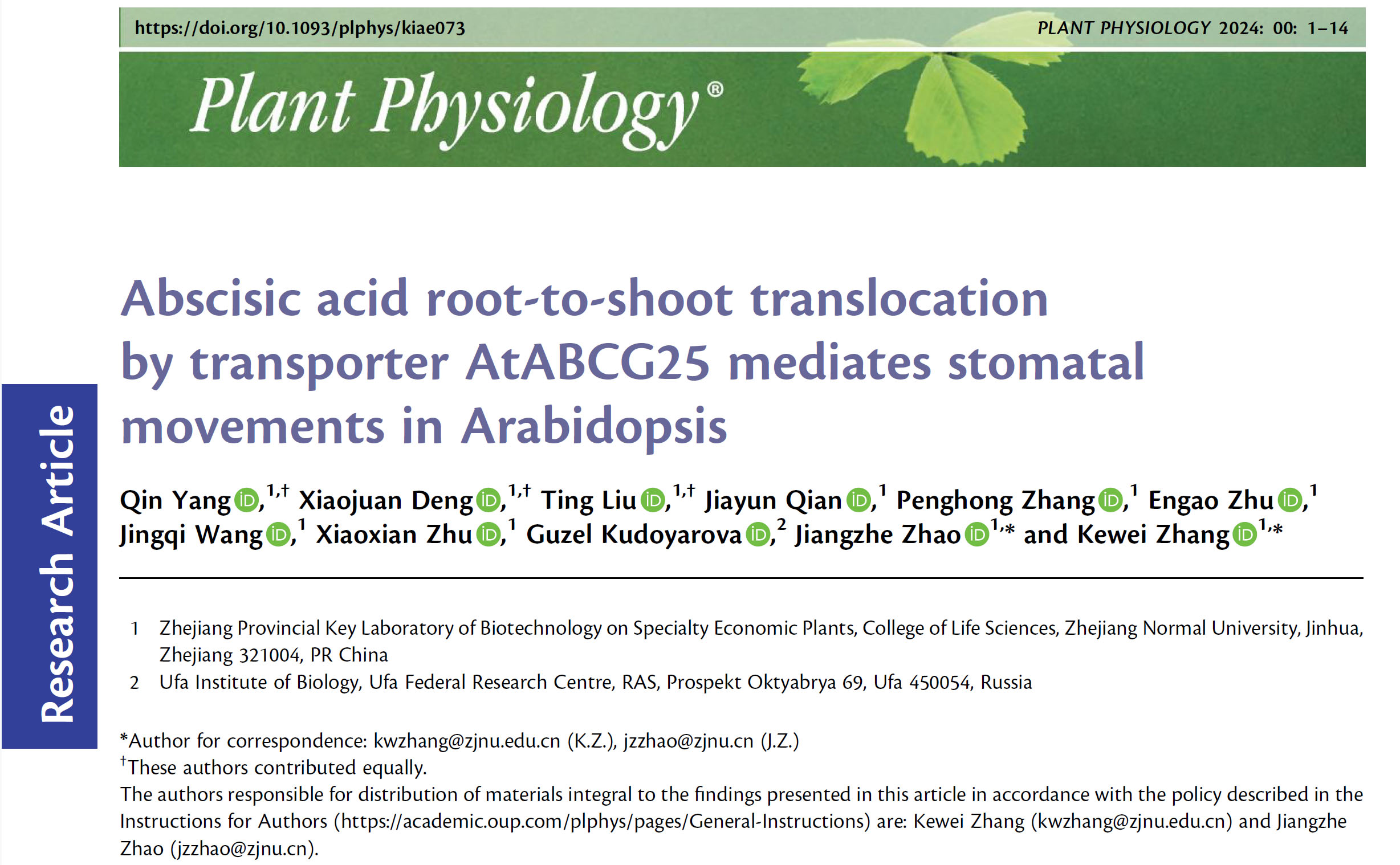 近日,浙师大生命科学学院张可伟教授团队在国际植物生理顶级期刊(一区TOP5 年影响因子8.97Plant Physiology在线发表了题为Abscisic acid root-to-shoot translocation by transporter AtABCG25 mediates stomatal movements in Arabidopsis”的研究论文,揭示了ABC转运蛋白AtABCG25负责由根向地上组织运输脱落酸(ABA)和脱落酸葡萄糖脂(ABA-GE)并调控气孔运动的分子机制。