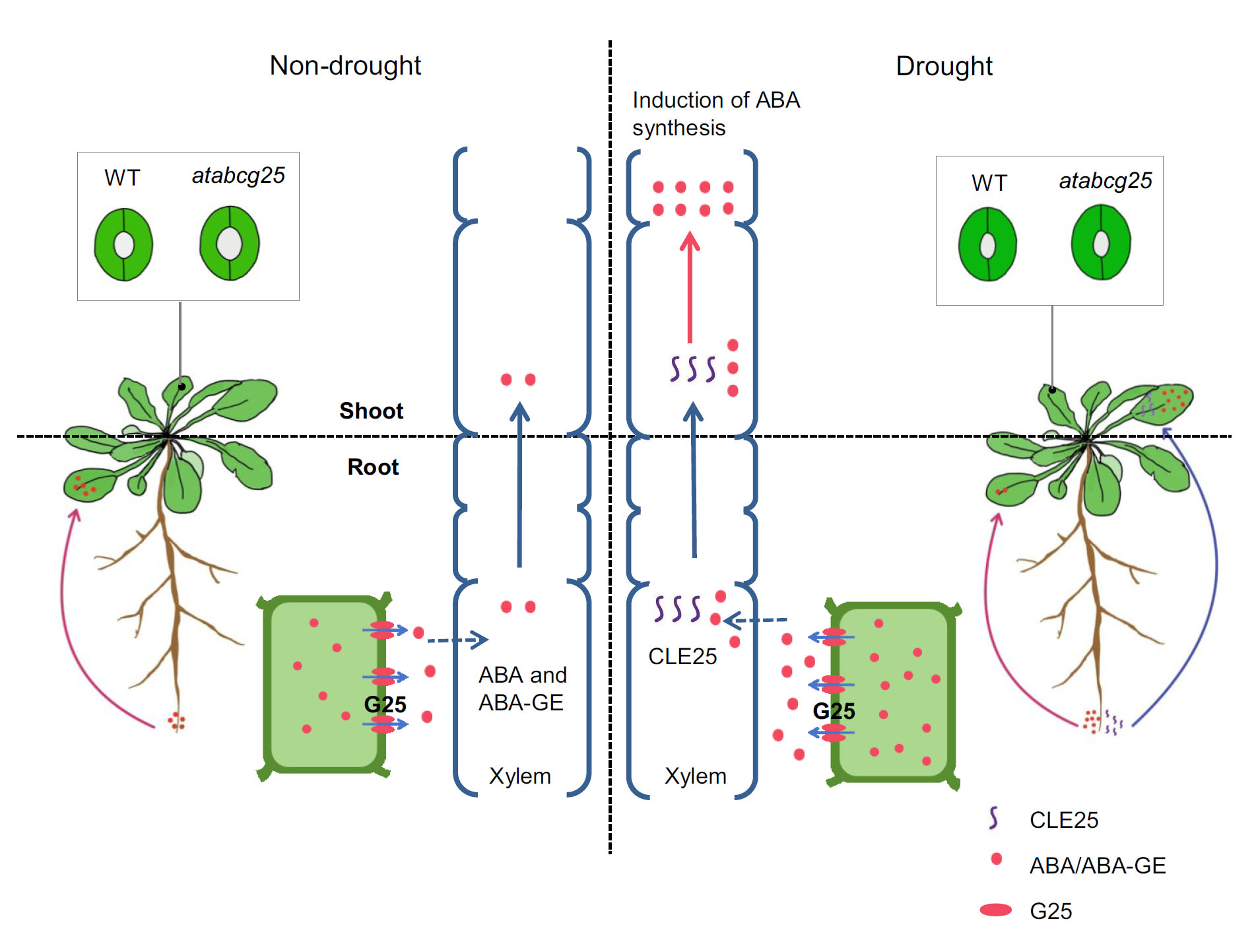 A proposed working model for long-distance transport of ABA and ABA-GE by AtABCG25 under non-drought and drought conditions.