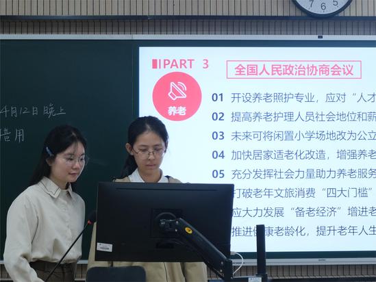两位主持人就最新一次的全国两会重点议题进行了汇报和分享,她们分别从养老、生育保障、新质生产力等大众关注的民生问题为切入点,对两会提出的解决方案进行了解读和分析,让同学们更为直观地感受到国家令人惊喜的变化,并带领大家一同学习领会全国两会精神。