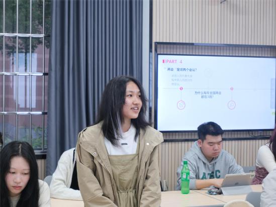 会议伊始,朱哲楠系统性地介绍了全国两会召开方式,内容涵盖两会由来、召开时间以及此次两会概况三个方面。随后,胡玥对两会内容做进一步阐述,将全国人民代表大会和全国人民政治协商会议的主要职能和二者之间的关联清晰地展现在大家眼前。