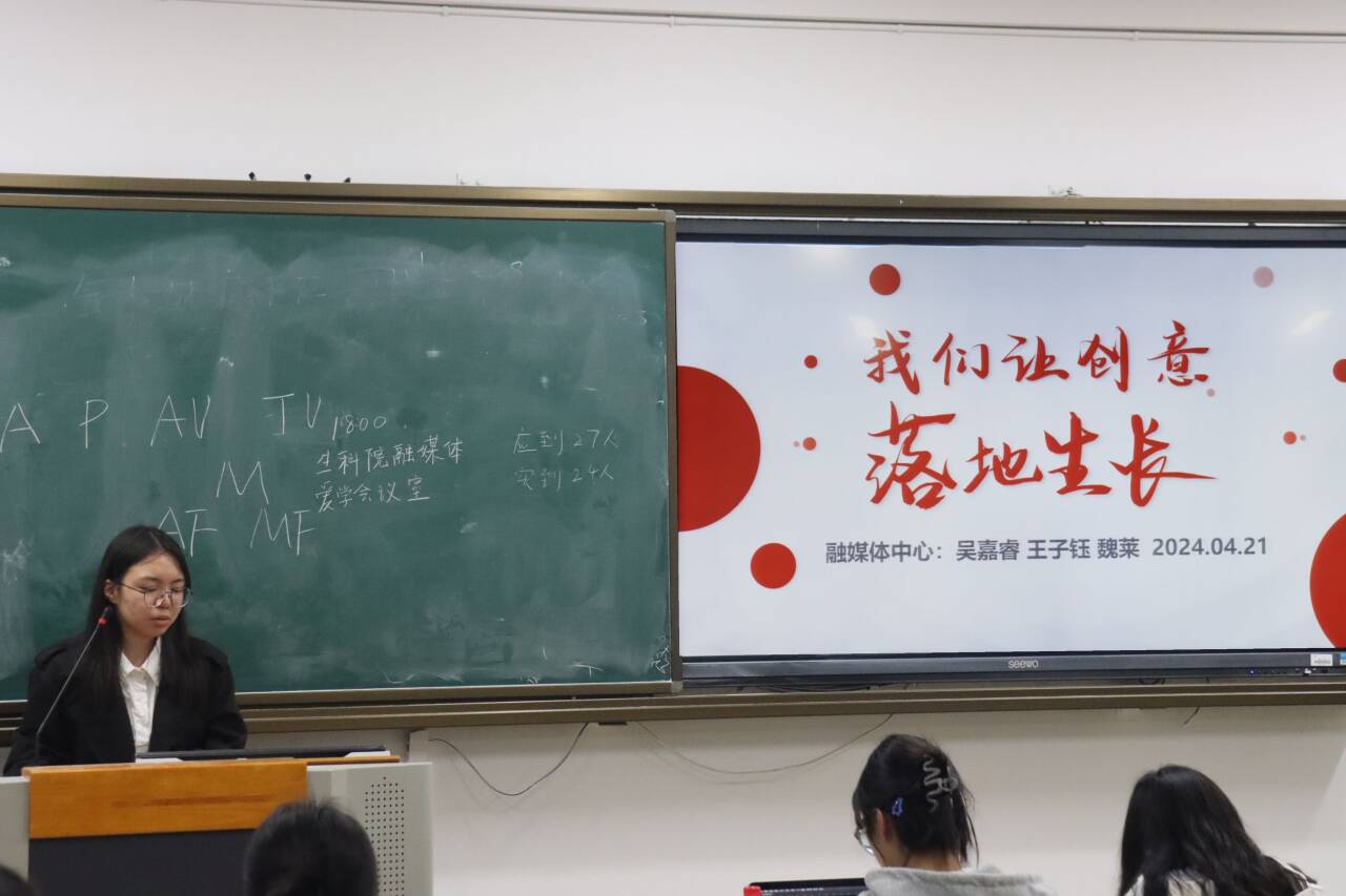 为了激发同学们的创作热情,感受融媒新魅力,并提高同学们对文字与影像的把控能力,4月21日晚,浙江太阳成集团tyc122cc入口融媒体中心在16幢106室开展了以“我们让创意落地生长”为主题的爱学会议室。融媒体中心新闻部吴嘉睿、摄制部王子钰、设计部魏莱共同主持了本次活动。