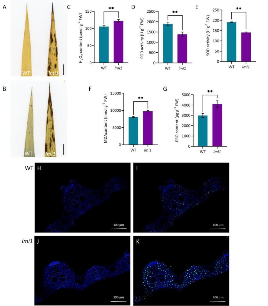 Fig. 3 – Physiological and biochemical analysis of wild-type and lmi1 mutant. (A) DAB staining. Scale bar, 1 cm. (B) NBT staining Scale bar, 1 cm. (C) H2O2 content. (D) POD activity. (E) SOD activity. (F) MDA content. (G) PRO content. (H–I) TUNEL plots of wild-type. Scale bar, 100 μm. (J–K) TUNEL plots of lmi1. Scale bar, 100 μm. *, P < 0.05; **, P < 0.01 (t-test).