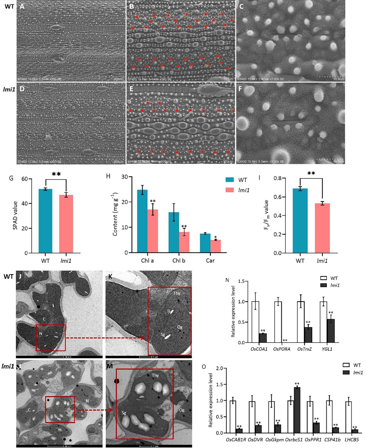 Fig.2 – Chloroplast development and photosynthetic efficiency in wild-type and lmi1 mutant. (A–C) Scanning electron microscopic observation of wild-type with fold changes of 200 ×, 500 ×, 3000 ×, scale bar, 200 μm, 100 μm, 10 μm. (D–F) Scanning electron microscopic observation of lmi1 with fold changes of 200 ×, 500 ×, 3000 ×, scale bar, 200 μm, 100 μm, 10 μm. (G) SPAD values. (H) Chlorophyll content. (I) Photosynthetic efficiency. (J–K) Chloroplast ultrastructure of wild-type. Scale bar, 20 μm, 1 μm. (L–M) Chloroplast ultrastructure of lmi1. Scale bar, 20 μm, 1 μm. (N) Chlorophyll synthesis related genes expression. (O) Chloroplast development related gene expression. *, P < 0.05; **, P < 0.01 (t-test). C, chloroplast; Thy, thylakoid; Og, osmophilic gramules; Sg, starch granule; N, nucleus.