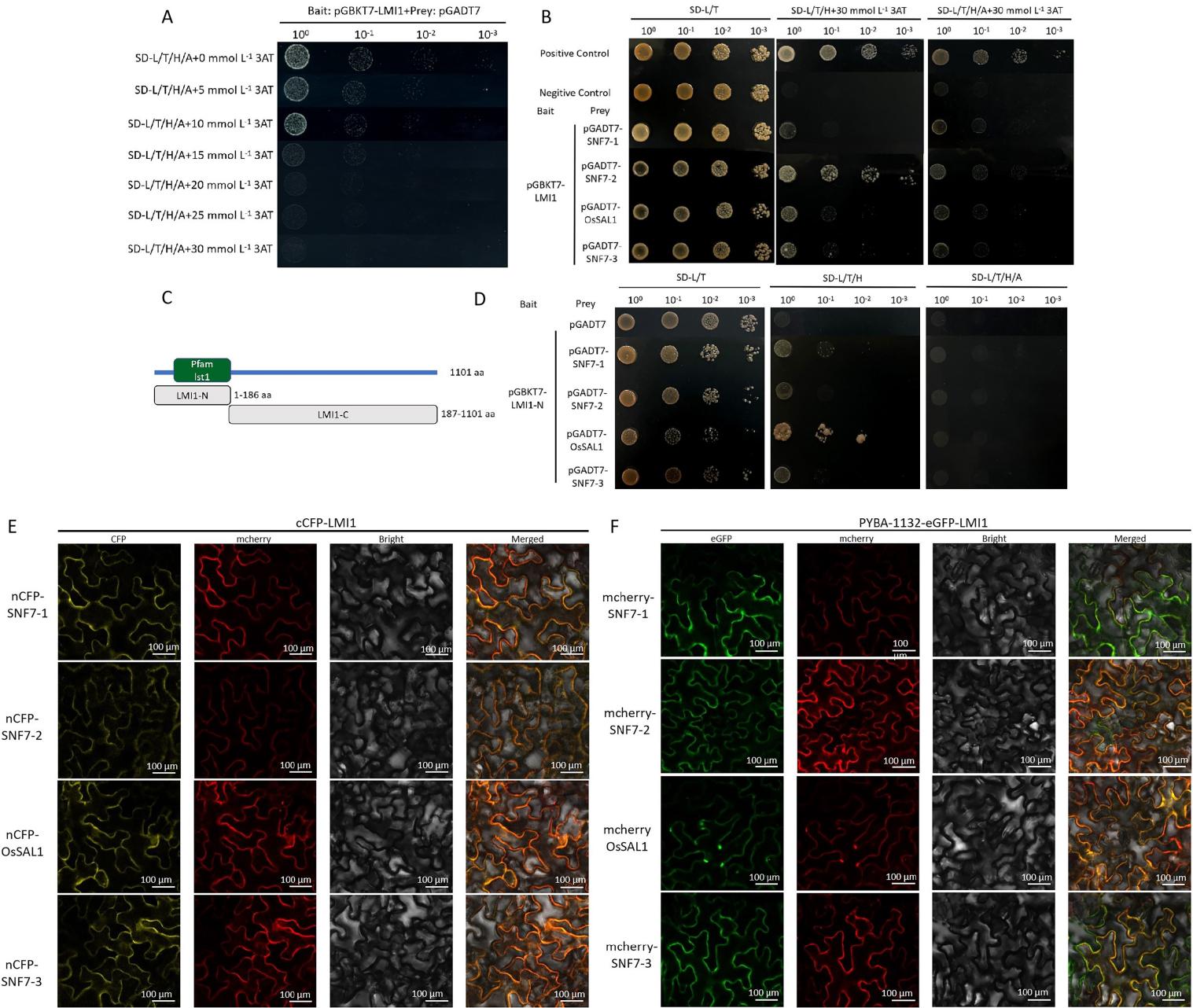 Fig. 5 – LMI1 interacts with phosphatase and components of ESCRT-III complex. (A) Validation and inhibition of LMI1 yeast bait autoactivation. (B) The yeast two-hybrid interaction analysis of LMI1 with 30 mmol L-1 3AT. (C) Schematic representation of the Pfam domain truncation of the LMI1 protein. (D) LMI1-N truncated yeast two-hybrid interaction verification analysis. (E) Verification of LMI1 BiFC, scale bar, 100 μm. (F) Gene co-localization verification of LMI1. Scale bar, 100 μm. Note: SD-L/T represented two-deficient solid medium lacking leucine (Leu) and tryptophan (Trp). SD-L/T/H represents triple deficient solid medium lacking leucine (Leu), tryptophan (Trp) and histidine (His). SD-L/T/H/A represents a four-deficient solid medium lacking leucine (Leu), tryptophan (Trp), histidine (His) and adenine (Ade).