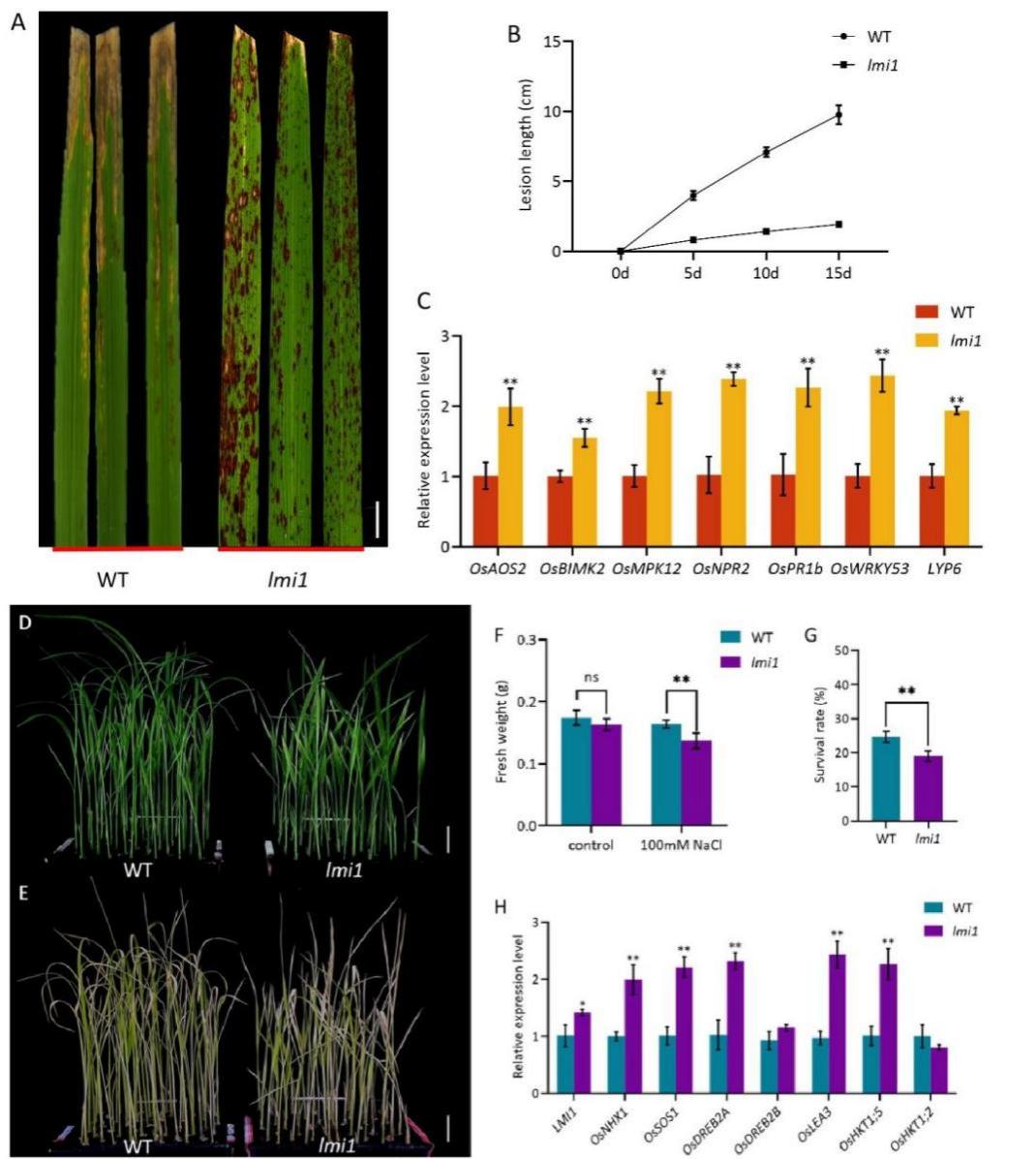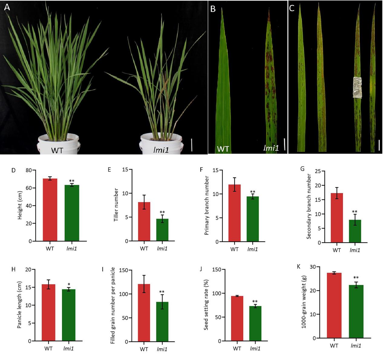 Fig. 4 – LMI1 regulates defense responses in rice.(A) Phenotypes of wild-type and lmi1 were observed 15 d after inoculation, scale bar, 1 cm. (B) Statistical results of bacterial blight spot length on 0, 5, 10 and 15 d after inoculation. (C) Defense related genes expression. *, P < 0.05; **, P < 0.01 (t-test).