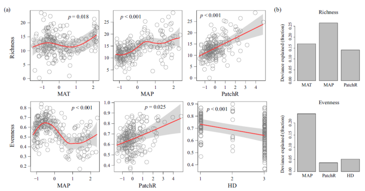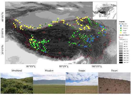图3. 研究点位分布图和孢粉丰富度和均匀度与环境因子的关系:Liao MN, Jin YL, Li K, Liu LN, Wang NN, Ni J*, Cao XY*. 2024. Modern pollen-plant diversity relationship in open landscapes of Tibetan Plateau. Palaeogeography, Palaeoclimatology, Palaeoecology, 641: 112131. https://doi.org/10.1016/j.palaeo.2024.112131