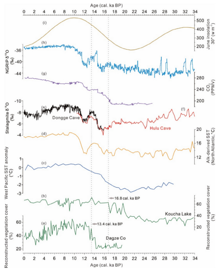 图1. 青藏高原中部达则错、寇查湖植被覆盖重建与古气候记录的比较:Liu LN, Wang NN, Zhang YR, Liang J, Ni J, Cao XY*. 2024. Spatial and temporal variations of vegetation cover on the central and eastern Tibetan Plateau since the Last glacial period. Global and Planetary Change, 240: 104536. https://doi.org/10.1016/j.gloplacha.2024.104536
