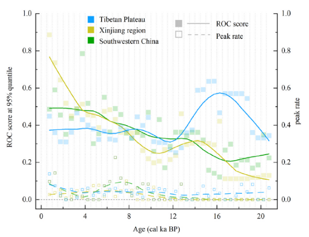 图2. 青藏高原植被变率与新疆和西南地区的差异:Zhou BR, Xu DY, Chen HY, Liao MN, Li K*, Ni J*. 2024. Different sensitivity of postglacial vegetation to climate and human disturbance between Tibetan Plateau and its surrounding regions. Quaternary Science Review, 342: 108911. https://doi.org/10.1016/j.quascirev.2024.108911