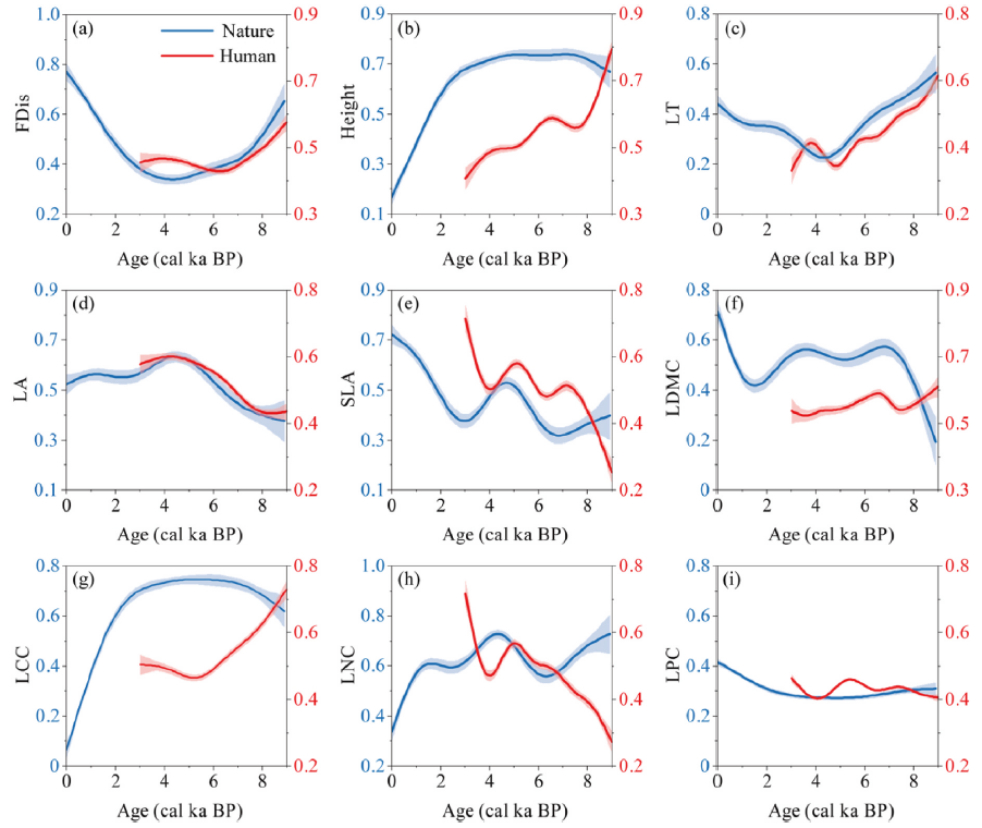 图5. 近9000年来浙江地区植物群落功能分异度FDis及植物功能性状的变化:Wang HY, Jin YL, Li K*, Liao MN*, Liu Y, Ma CM, Ye W, Zhang Y, Luo YK, Ni J. 2024. Holocene Neolithic human activity shaped ecosystem functions through the altering of vegetation traits in Zhejiang, eastern China. Quaternary Science Reviews, 335: 108762. https://doi.org/10.1016/j.quascirev.2024.108762