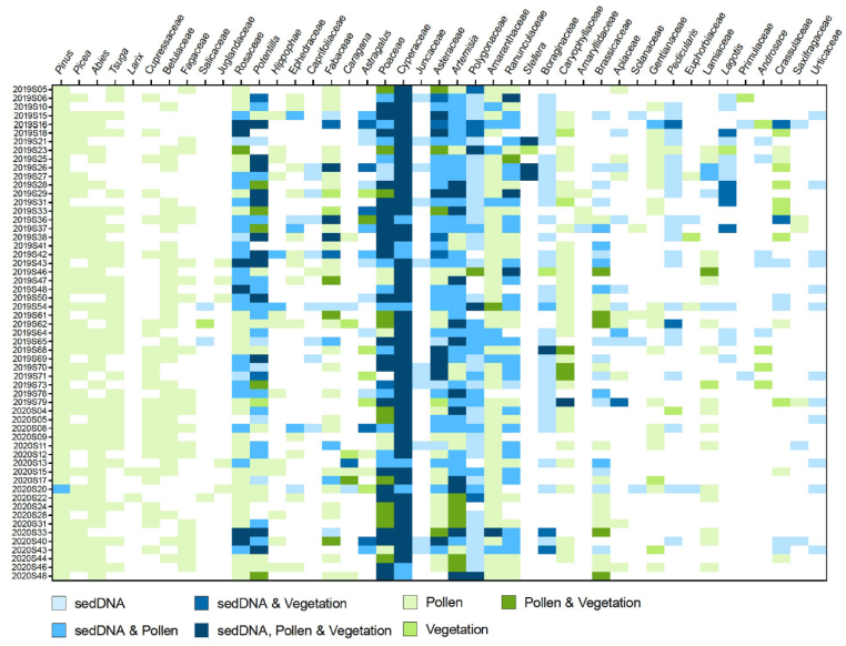图4. 青藏高原中西部植物sedDNA、花粉和植被调查结果的比较:Wu K, Li K*, Jia WH, Stoof-Leichsenring KR, Herzschuh U, Ni J, Liao MN, Tian F. 2024. Application of plant DNA metabarcoding of lake sediments formonitoring vegetation compositions on the Tibetan Plateau. Science China Earth Sciences, https://doi.org/10.1007/s11430-023-1358-0