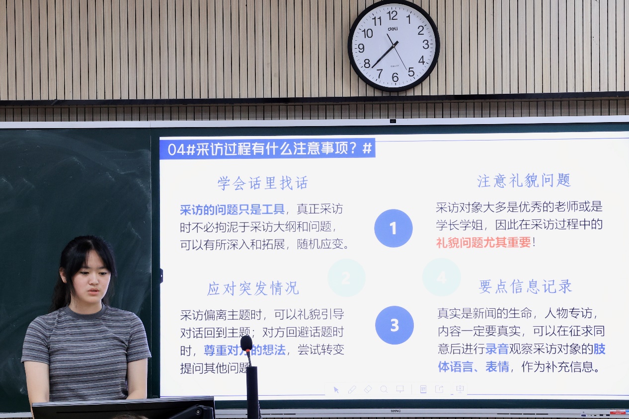 潘思含以人物采访为主题,从何为人物采访、我该怎么准备采访、采访的时候我该说什么、采访过程中有什么注意事项、我该怎么撰写采访正文、文章写完之后该做什么、采访发布有什么注意事项七个问题出发,向大家进行人物采访的介绍。同学们系统地了解到采访人物的基本方法和步骤,培养采访能力,提高文字质量。