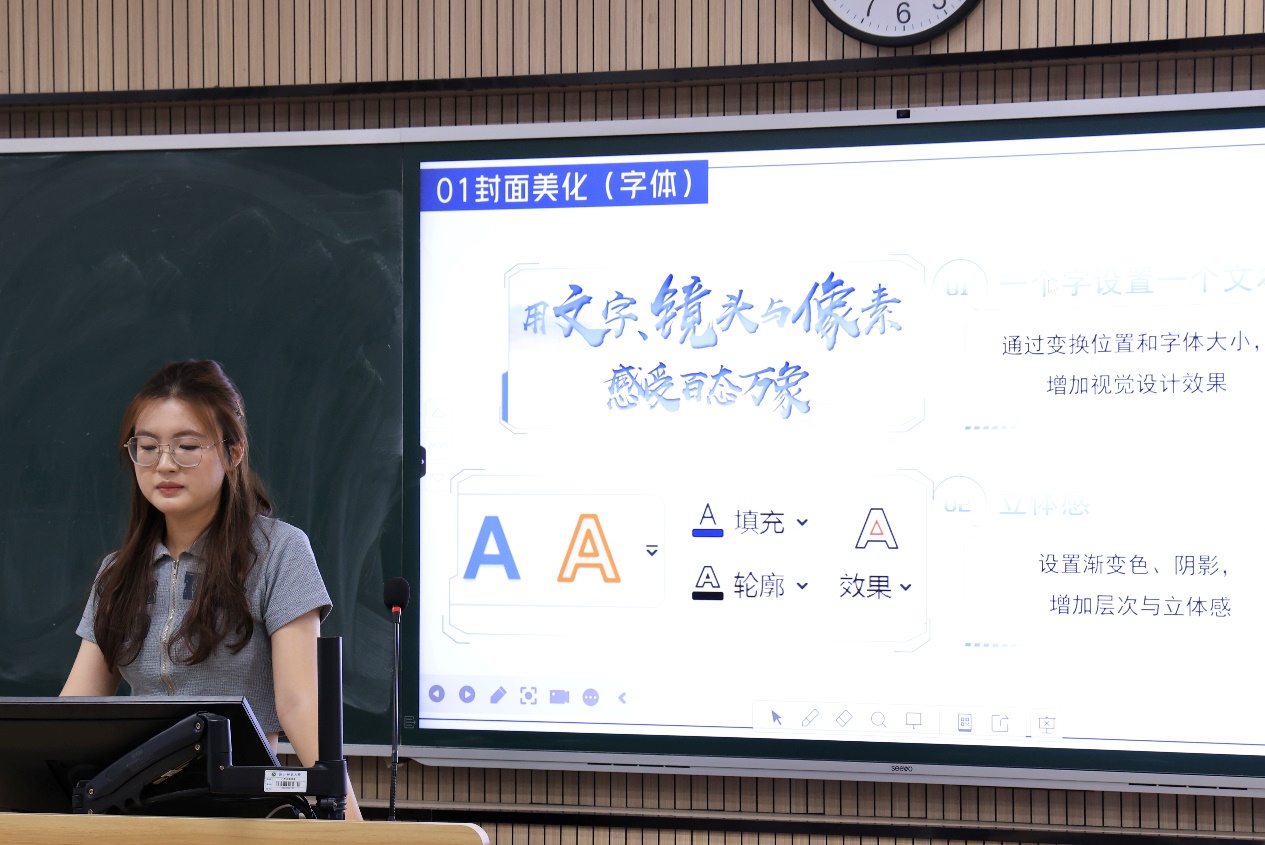 王瑞虔从PPT封面美化切入,通过对渐变填充、文字内容精简化、参考线和动画效果等实用小技巧的讲解,,带领同学们深入探索PPT制作方法,提高大家的制作PPT、优化PPT内容的能力。