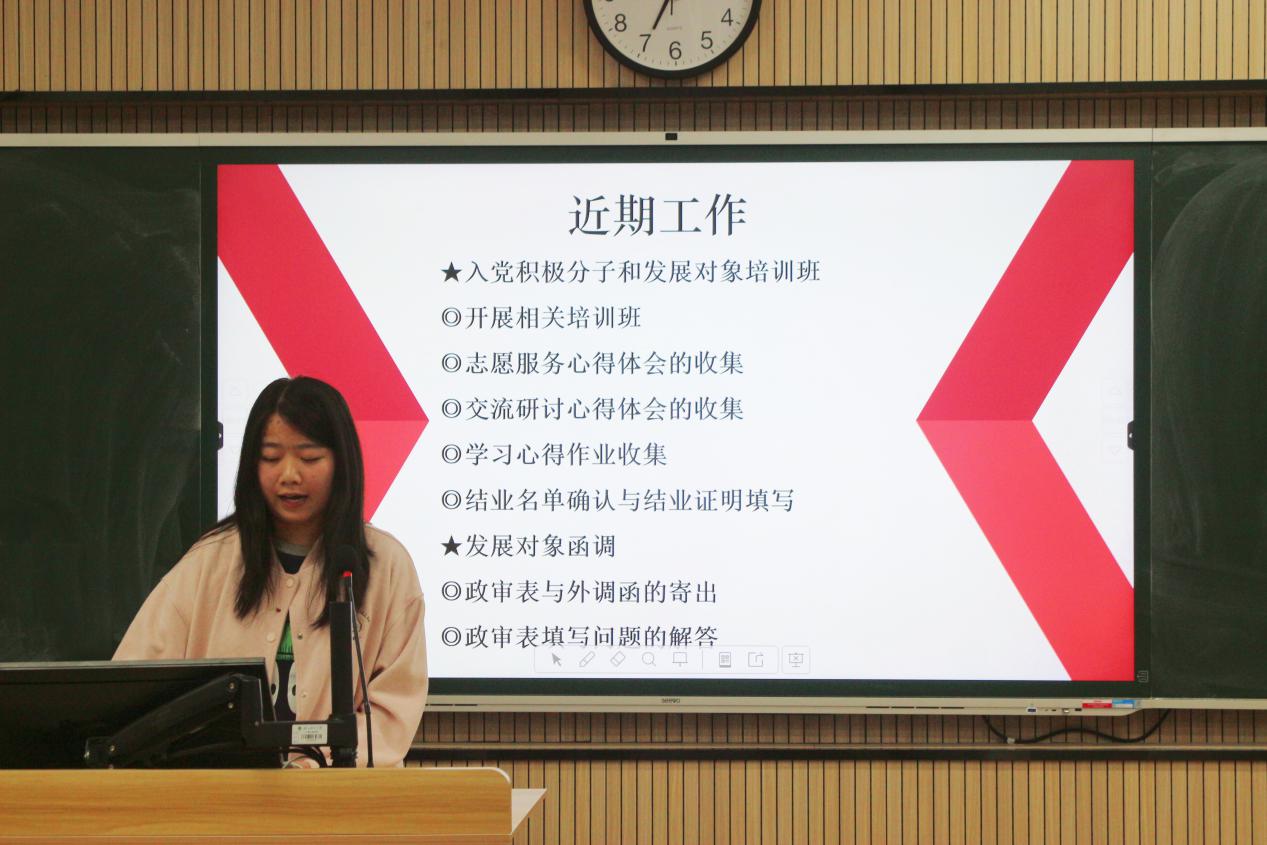 会议伊始,会上,周发表讲话。她结合中央八项规定的内容,倡导精简会议,对学生干部们过往的辛勤付出表达诚挚感谢,并提醒大家在忙碌工作的同时也要兼顾学业。此外,周还对大家同学们提出期望:要有坚定的理想信念,在风云变幻的国际局势下站稳立场;要积极掌握新技术,在新媒体时代脚踏实地开展工作,保持独立思考;要勇于担当,把工作视为挑战自我、提升能力的机会;要有面对压力的豁达乐观,合理安排学习、工作与休闲时间。