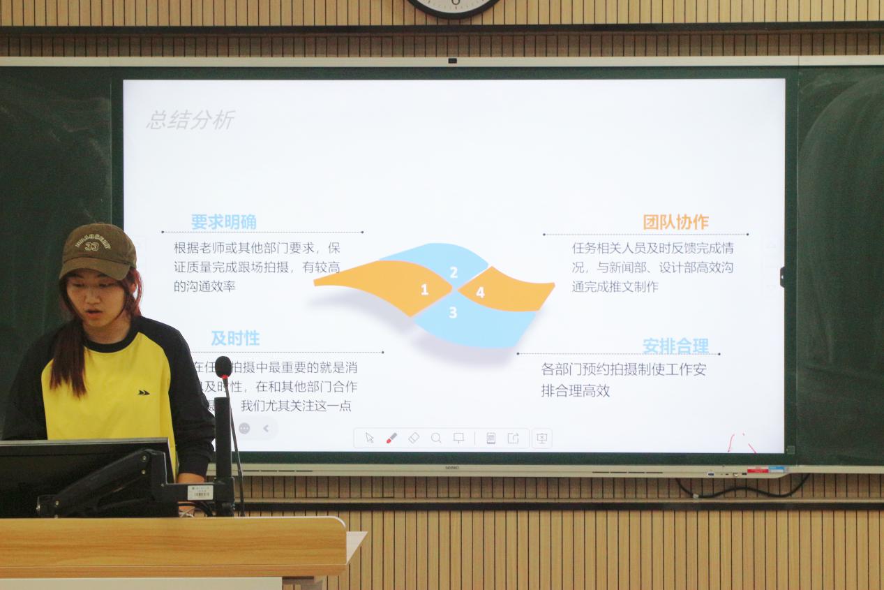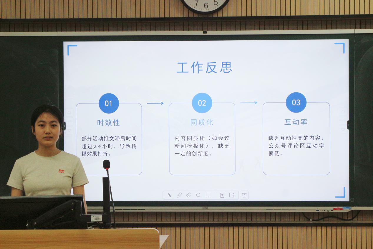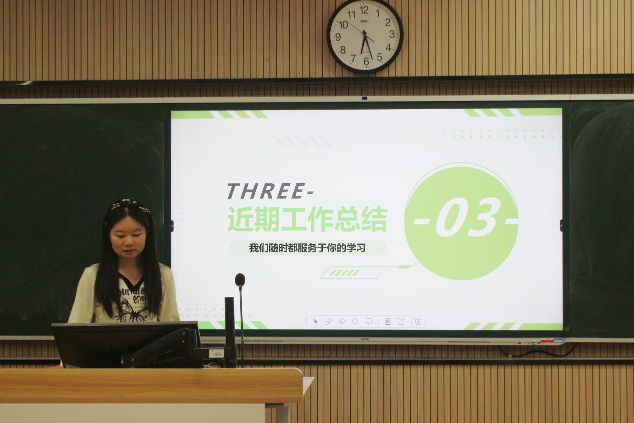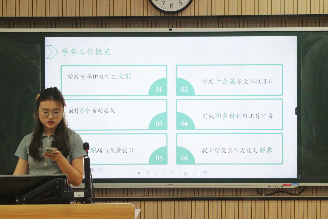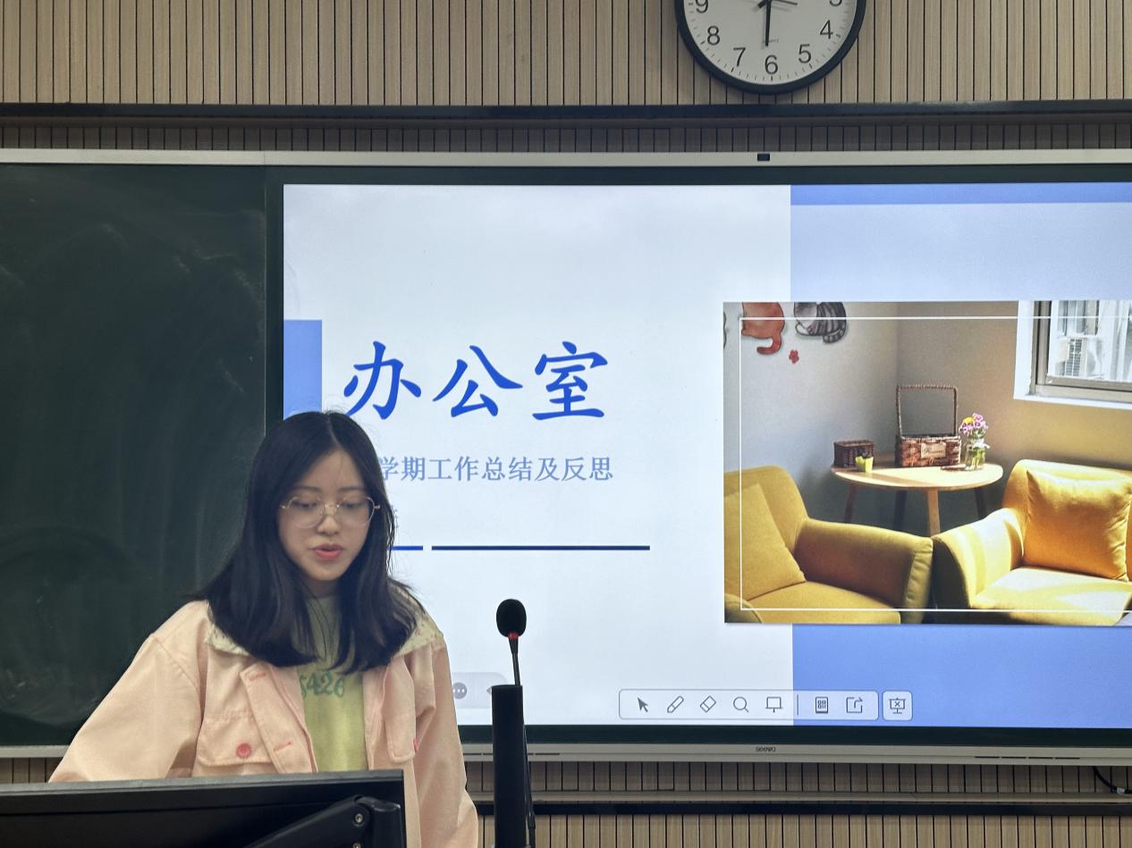随后,各部门代表依次上台总结工作。办公室梳理资料收集等日常工作,针对讲座制度争议问题提出改进方案;组织部汇报团组织建设成果,明确加强团务培训计划;生活权益部展示寝室检查等工作,针对查验失误等问题表明整改决心与措施;纪检部介绍早晚自习管理等工作进展及优化方向;体育部分享体育竞赛成果,针对活动宣传、时间安排等问题计划改进;学习部汇报承办赛事等工作,助力提升学生综合素质;心理部介绍心理活动开展情况,针对活动冲突等问题提出解决方案;文艺部回顾文艺活动,计划策划更多元活动、加强营员培训;院科协梳理寒调大赛等工作,针对申报宣传、格式规范问题提出改进措施;志愿实践部展示多组志愿活动成果,从社会需求和新媒体平台方面优化工作;社团服务部总结社团管理工作,反思不足过往并规划未来。