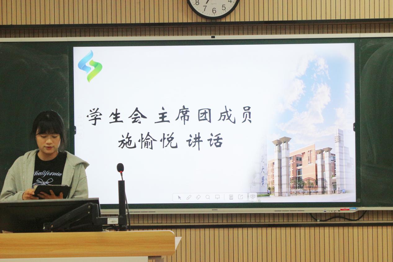会议尾声,主席团成员施愉悦带领大家学习中央八项规定及其精神。强调学生干部要勤俭节约,推行无纸化办公,减少一次性用品浪费;密切联系同学,杜绝官僚主义,增强服务意识,切实为同学解决困难。