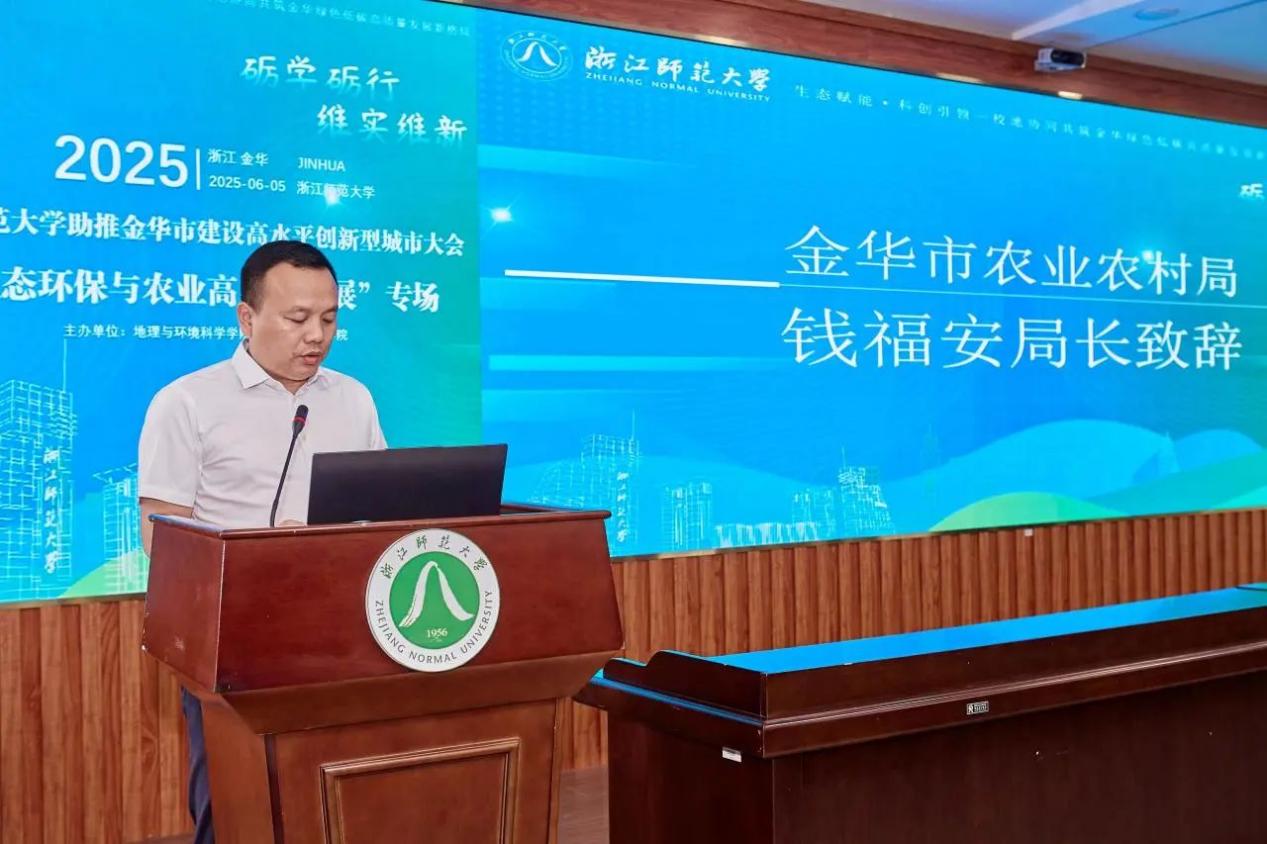 钱福安代表市农业农村局,向长期关心支持金华“三农”工作的浙江师范大学和各类企业表示最衷心的感谢。他指出,近年来金华市深入贯彻习近平总书记关于三农工作的重要论述,绘就村美、人和、共富的乡村振兴图景。然而,当前农业高质量发展仍面临诸多瓶颈,对此,要不断强化校企科研合作,搭建平台,让更多科研成果转化为现实的生产力。展望未来,将以本次活动为契机,全面贯彻习近平总书记坚定不移走生态优先、绿色发展之路的重要指示要求,秉承“改革、创新、开放、合作”的理念,建立更加紧密、更加牢固的效益合作关系,携手共谋金华三农绿色低碳高质量发展新篇章。