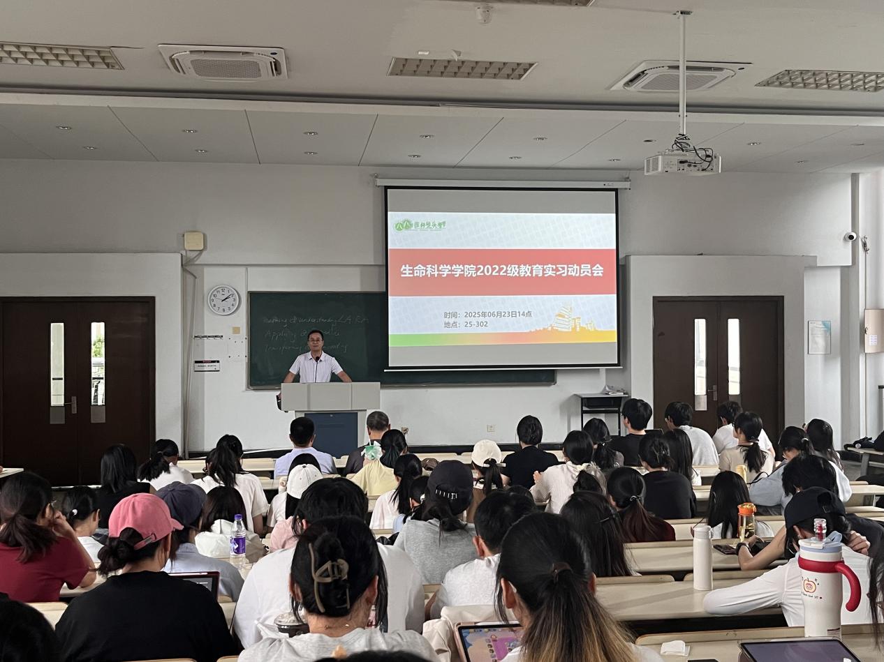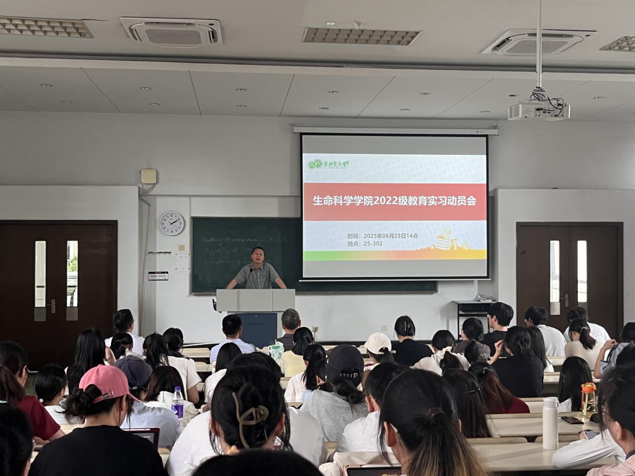 为提升学院学生教学技能,将理论知识转化为实际教学能力,培养学生职业素养, 623下午,学院于25302室举行了2022级教育实习动员会。院长助理吴智华主持并作动员指导,实习指导教师邬凌羽、汪甜、杨振曦、陈崇斌以及教务办主任姚林波参加活动。生命科学学院22级全体本科生参会。
