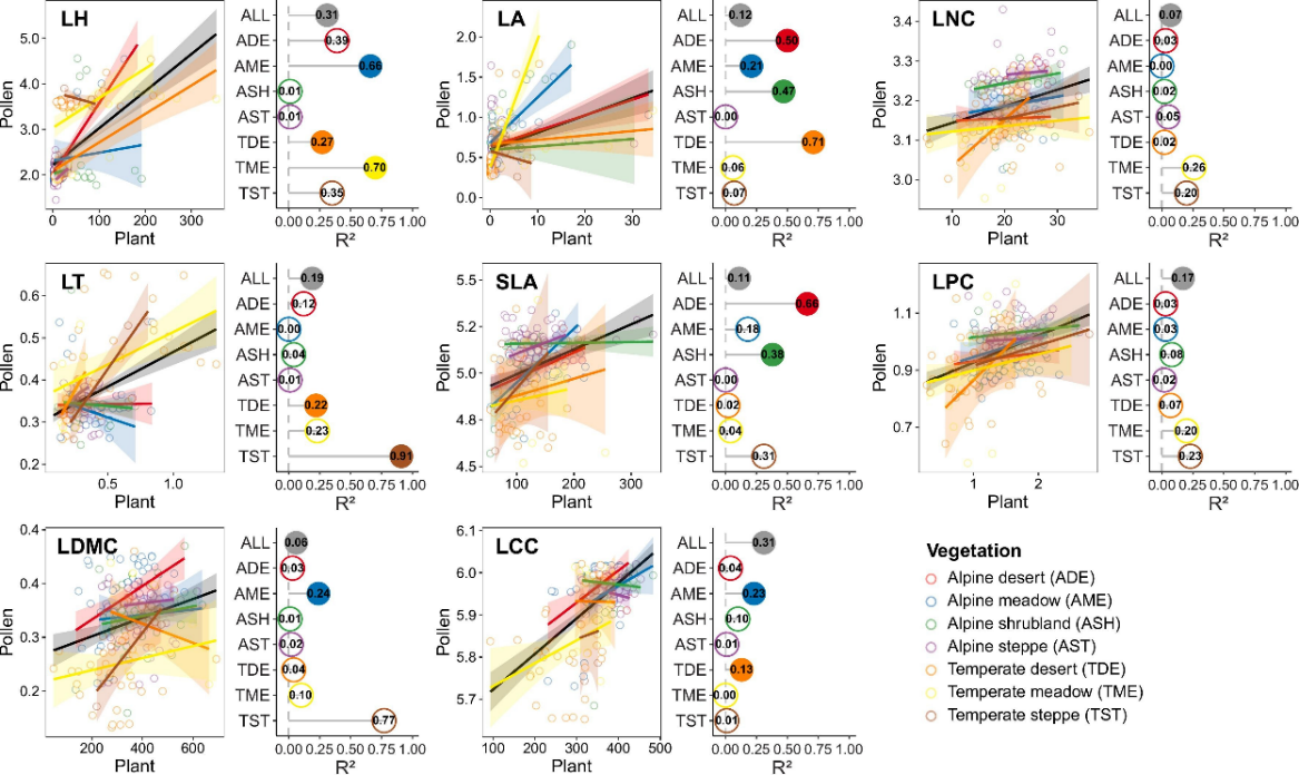 植物功能性状是植物响应和适应外界干扰的重要机制,对维持群落稳定性和实现生态系统功能具有重要作用。但是在青藏高原独特的高寒生态系统中,植物功能性状特征和空间格局尚不清楚,致使对植物功能性状与高寒植物群落构建关系的理解难以深入。基于课题组第二次青藏高原综合科学考察获得的植物功能性状数据、植物样方调查数据和表土孢粉数据,博士研究生金伊丽对青藏高原3000 m以上高寒植被区237个站点1314个个体的7个叶片性状进行了分析。结果显示,青藏高原植物性状与中国植物相比存在明显差异,并且大多表现出显著的空间变异性(图2),气候和土壤解释了29.23%的性状变异,高寒植物通常采用保守策略来应对青藏高原上的恶劣条件,但这种策略在大空间尺度和环境梯度上存在差异。廖梦娜副教授利用孢粉、植物调查数据和植物性状数据,系统全面地评估了基于孢粉开展的性状古生态学的优势和不足。结果显示,孢粉可在大空间范围内反映植物功能性状,可用于揭示植物群落功能的时空变化过程以及反映气候变化背景,但其准确性受到植被类型的影响,而且并非所有基于孢粉计算的功能性状指数都具有生态意义(图3)。上述结果有利于进一步理解基于孢粉的植物性状古生态学的优势和不足,推动性状古生态学的进一步发展。