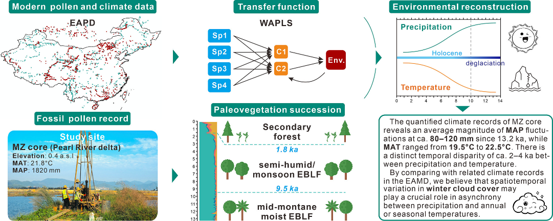 课题组张潇副教授与中山大学合作,通过对珠三角沉积钻孔进行孢粉分析,恢复了珠三角地区过去1.3万年的植被变化过程,并利用改进的孢粉-气候定量关系算法,重建了温度和降水的长期变化历史,指出冬季云量是造成我国亚热带地区季节性温度和降水不同步的重要原因(图5)。