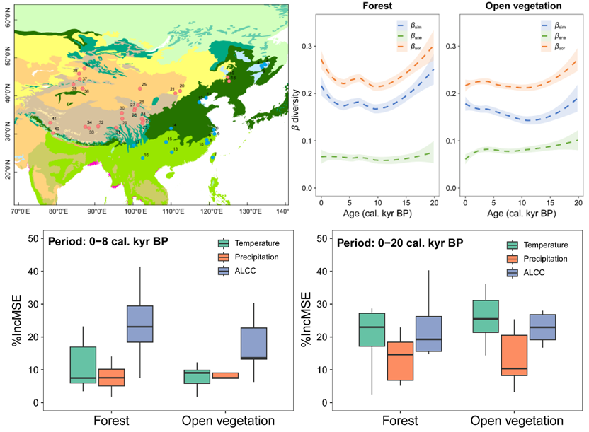 图1. 过去2万年森林和开放植被中植物β多样性拟合以及不同驱动因素对总β多样性的相对贡献:Liao MN, Li K, Liu LN, Zhang X, Zhang Y, Cao XY, Liu XQ, Ni J*. 2024. Different trajectories of floristic diversity in forested and open landscapes in China over the past 20,000 years. Science of The Total Environment, 957: 177701. https://doi.org/10.1016/j.scitotenv.2024.177701