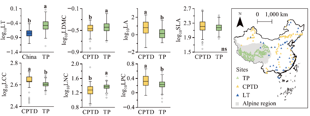 图2. 青藏高原和中国植物叶性状对比:Jin YL, Liao MN, Hou Y, Wang HY, Xia HJ, Xia J, Wu K, Zhou BR, Li K, Ni J*. 2024. Spatial patterns and variations in leaf traits of alpine plants on the interior Tibetan Plateau. Global Ecology and Conservation, 53: e03037. https://doi.org/ 10.1016/j.gecco.2024.e03037